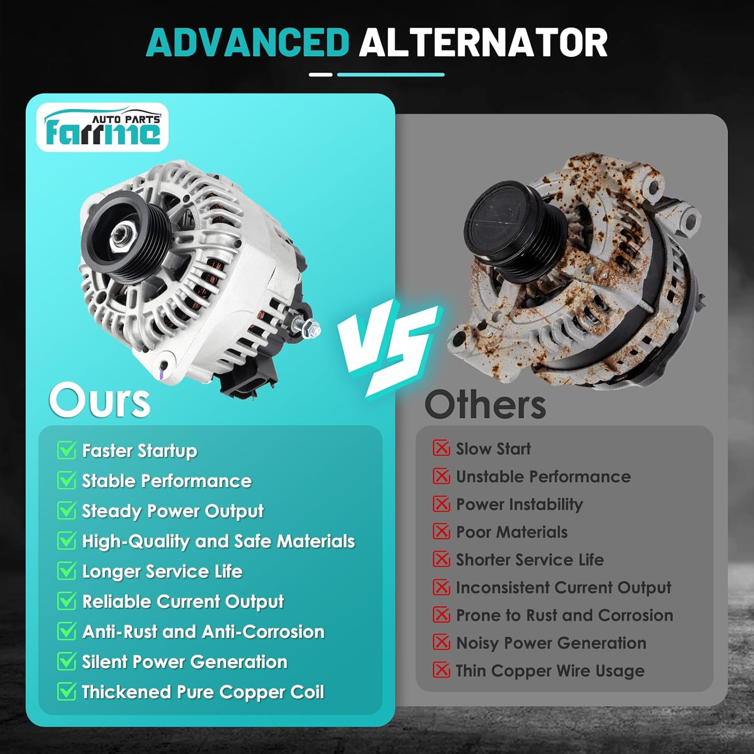 • 【Durable Construction】Farrme Auto Parts Alternator is constructed using premium materials, including precision CNC machining castings, Die-cast aluminum alternator, Pure copper winding, external insulating coating to ensure exceptional resistance to heat, vibration, and corrosion. Whether you're driving through rough terrains or facing extreme temperatures, this 1OO% NEW Alternator provides consistent and strong power output. All finished car alternators are fully tested to O.E.M. specifications and standards for performance and fit.