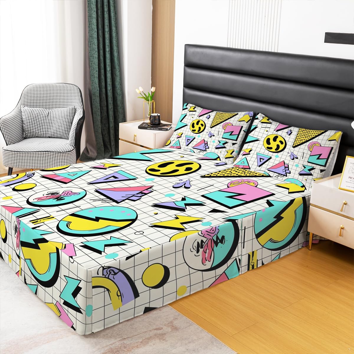 80s 90S Fashion Style Bed Skirt Queen Size,Retro Memphis Style Bedding Decor Geometric Shapes Bed Skirts for Kids Child,Funky Hipster Old Fashioned Bedskirt Geometric Bedroom Decor