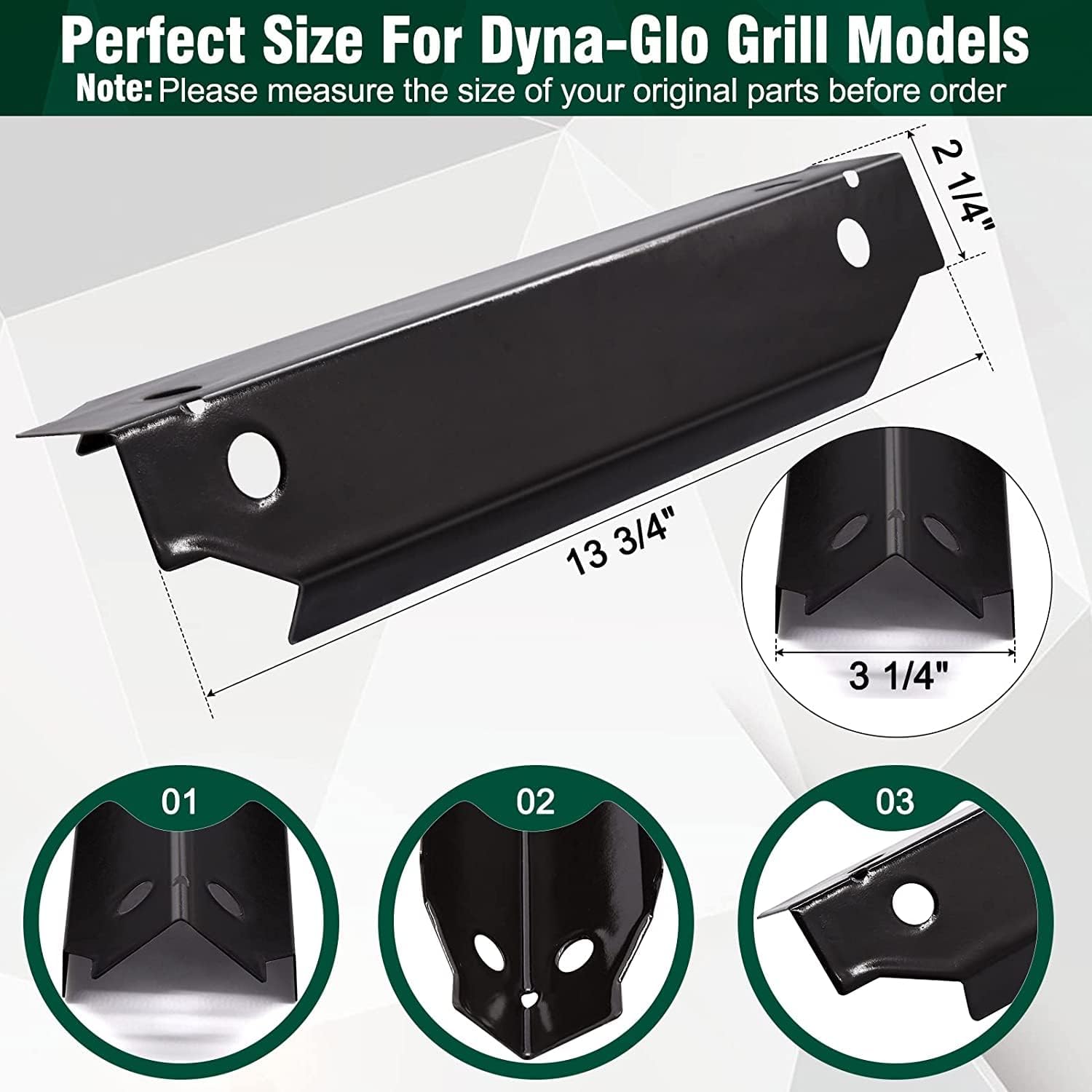 The Dyna-glo DGC310CNP-D grill parts is made of Heavy duty steel to ensure long-lasting use, which can distribute heat evenly across entire surface. Compare with the original parts, the material of our dgc310cnp-d parts are more heavy duty, last longer, extend the life of your grill with this part.Features:【Grill Heat Plate】★ Dimensions: 13 3/4" x 3 1/4"★ Materials: Porcelain Steel★ Original part number: 70-01-673【Grill Burner 】★ Dimensions: 13-1/2" x 1"★ Materials: Stainless Steel【Grill Grates】★ Dimensions: 19 3/5" x 15 2/5"★ Material: Porcelain Coating steelGrill Replacement for:➤ Dyna-Glo Gas Grill Models: DGC310CNP-D, DGC310RNP-D, DGC310BNP-D, DGB310SSP ➤ The Dyna-glo DGC310CNP-D grill replacement parts include 3 pack grill heat plates and 3 pack grill burner tubesAdvantage & Benefit:👉 Perfect fit, Work well👉 Very easy to install👉 Much cheaper than buying locally👉 Made your grill like new again👉 Extend the life of your old grill