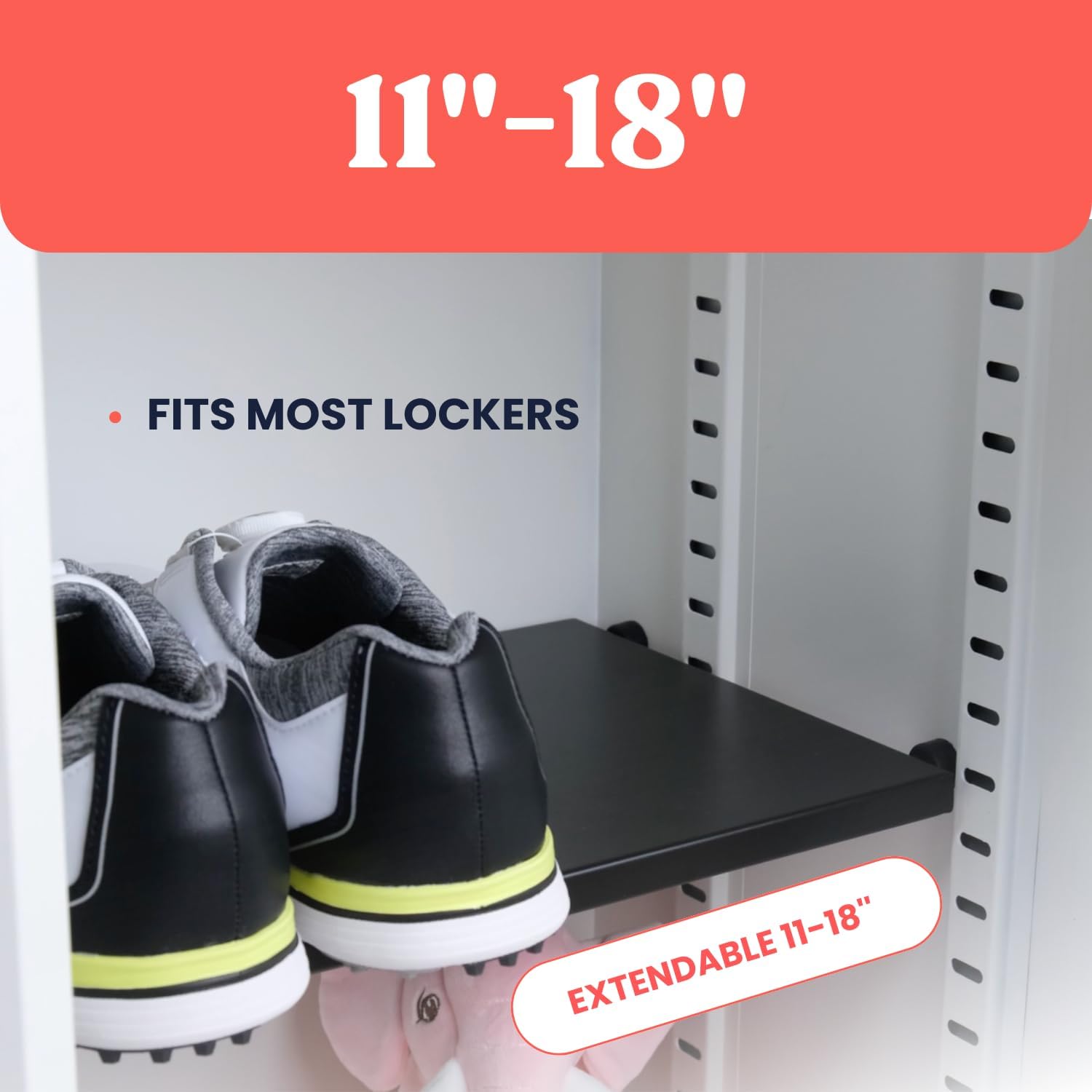 • Sleek & Rock-solid Locker Organizer: Optimize your Cabinet or locker storage with a shelf measuring 10 inches in depth and 10 inches in width (+1'' of rubbers) when compact, extending up to 18 inches in width when needed. Its sleek, less than 1/2 inch thickness, adds robustness to your space. Thé premium choice among cabinet or locker shelves.