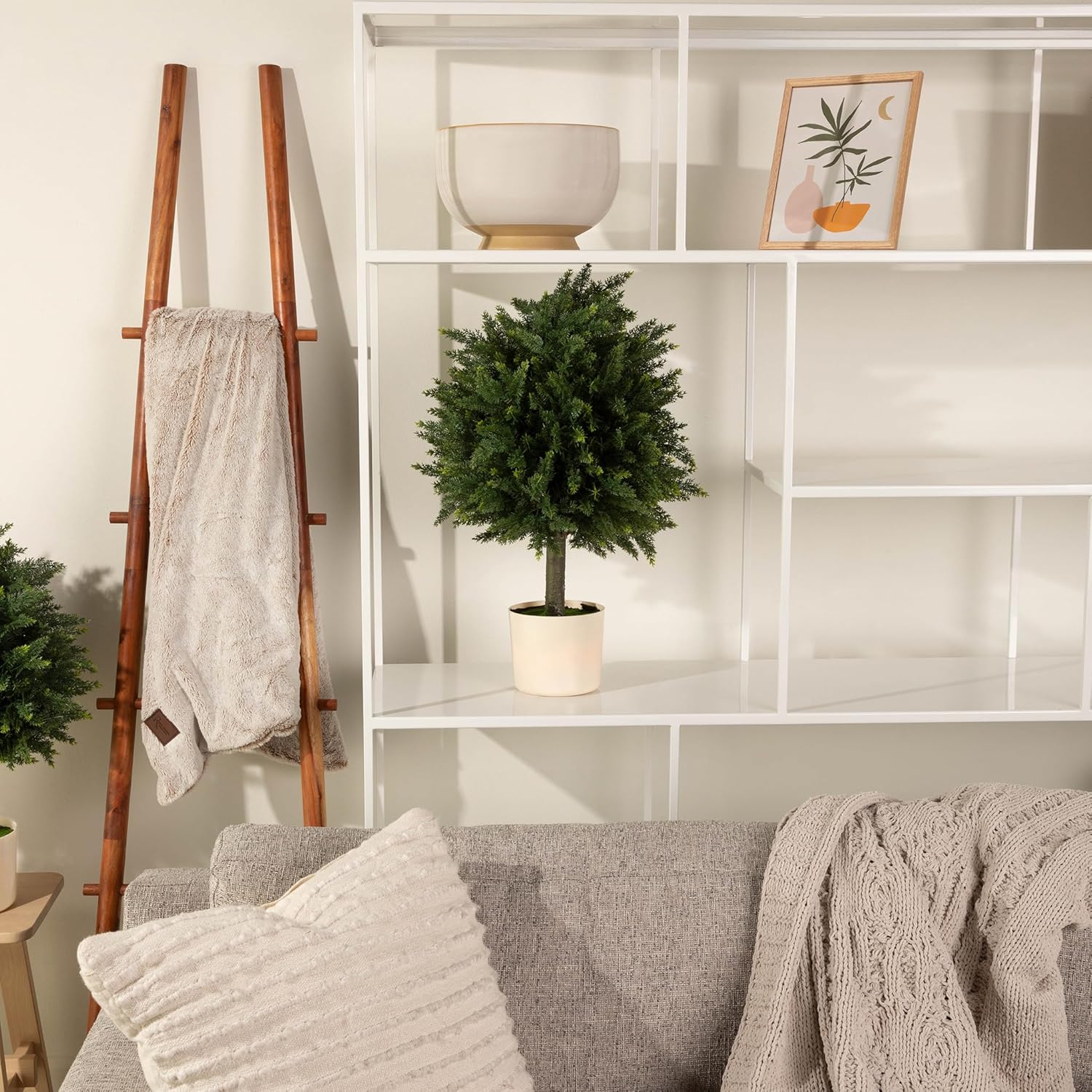 Add elegance to any entrance with these set of two,16-inch Potted Japanese Boxwood Ball in beige planters. Designed with full, lush foliage and a concrete-weighted base, it delivers high-end curb appeal without the work. UV and weather resistant, it keeps its shape and color year-round—perfect for flanking your front door, poolside, or balcony railing.