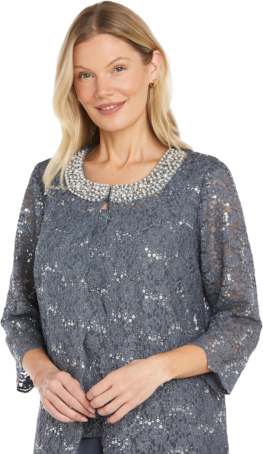 Gracefully tailored for special occasions, this 3-piece outfit effortlessly combines comfort with elegance. The standout feature is the 3/4 sleeve scalloped-edge lace jacket, detailed with pearl trim around the neckline and soft allover sequins. A coordinating sequin tank top and sleek solid pants complete the look, offering a flattering fit that's perfect for any event. Whether you're attending a wedding banquet, or evening celebration, this set brings effortless glamour to your wardrobe.