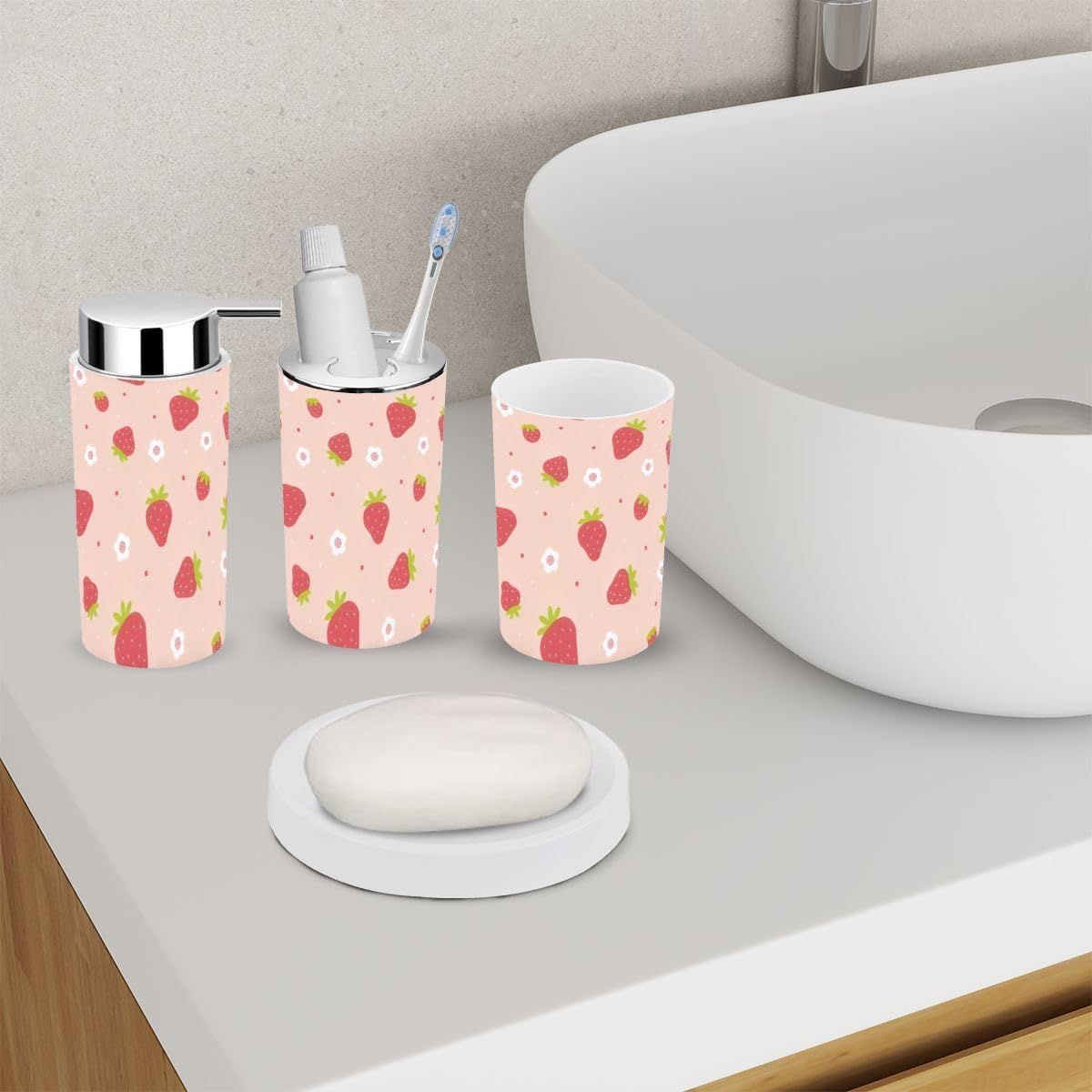 - Lotion DispenserIt can be pressed by one hand and rebound automatically. Use our soap dispenser for liquid hand soap, dish soap, lotion, shampoo, body wash, massage oils, etc.- Toothbrush Cup- Toothbrush HolderFits most sizes of toothbrushes, toothpaste, etc.- Trash CanWith swing lid, it's convenient for using.- Toilet Brush HolderHide the brush head inside the base- Soap DishIt can leak and keep dry.Please Note:1. Please allow tiny size difference for manual measurement.2. Please confirm the size before purchase.