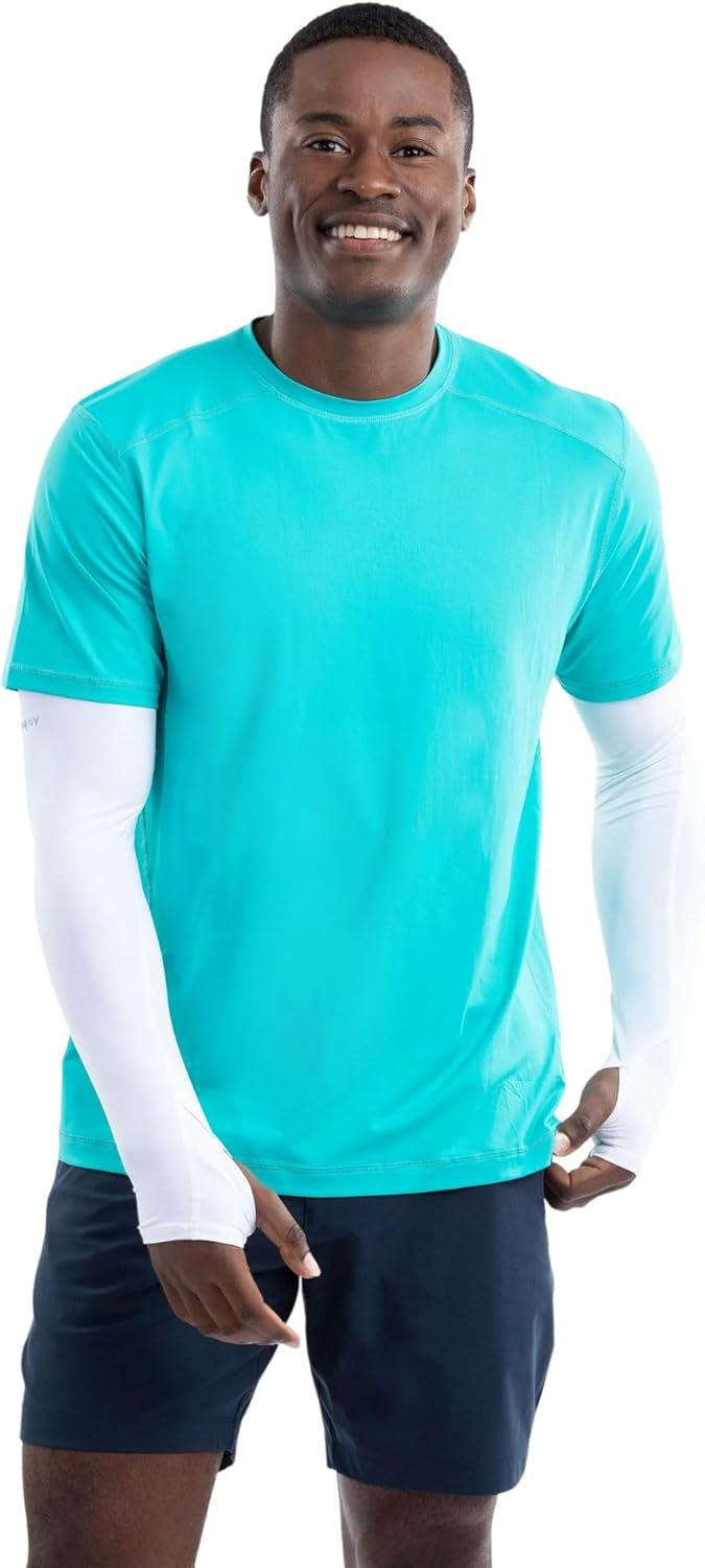 The BloqUV 50+ UPF mens short sleeve sun protection crew shirt is the perfect top to be worn alone, as a base layer, swim shirt, and great with athletic shorts. This top offers comfort, freedom of movement and is perfect for indoor workouts, running, biking, swimming, paddle boarding, fishing, boating, tennis, working out or just looking sharp at leisure. BloqTek is exclusive to BloqUV. UPF protection never washes out and fabric provides 5 degrees cooling effect when wet with water or sweat. UPF is equivalent in ratings and capabilities to SPF for sunscreens. (An average white cotton white top only has UPF of 5.)